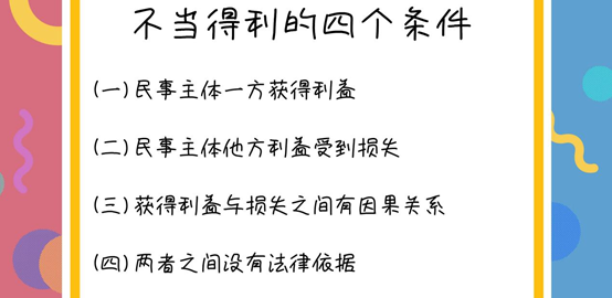 《中华人民共和国民法总则》第一百二十二规定,因他人没有法律根据,取得不当利益,受损失的人有权请求其返还不当利益。在司法实践中,不当得利的构成需要满足四个基本条件: